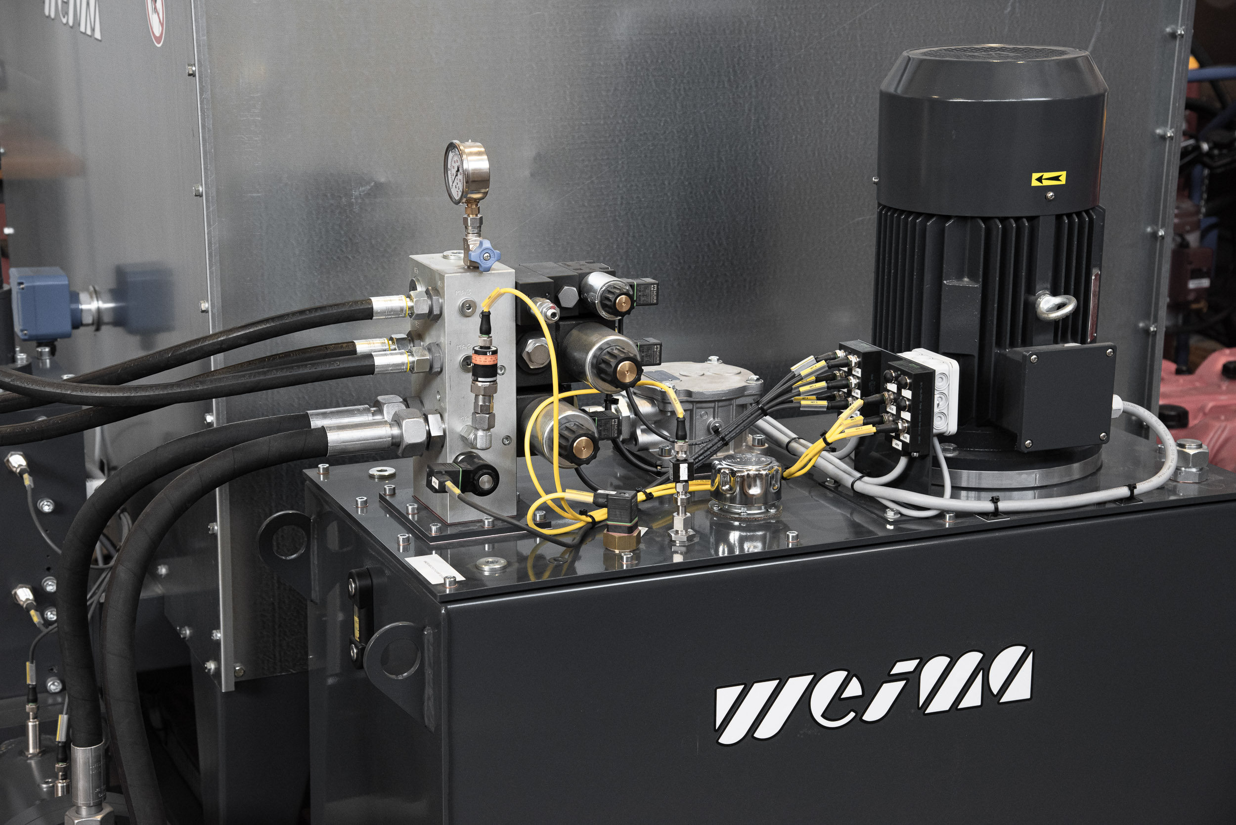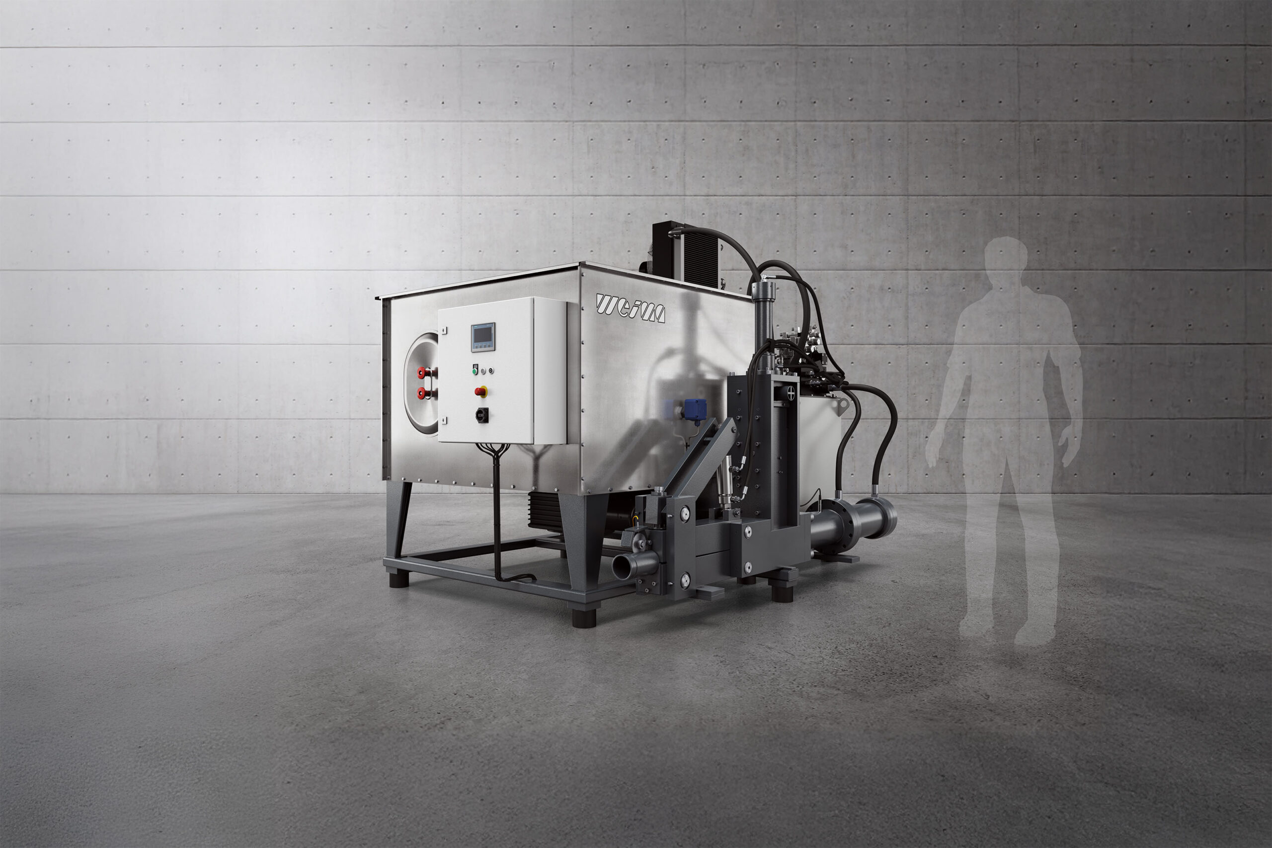 Die Hydraulik ist platzsparend aufgebaut und zugleich auf stabile Betriebsbedingungen ausgelegt. Das Aggregat verfügt über einen separaten Öltank, Pumpenmotor und vollständige Ventilsteuerung in kompakter Anordnung direkt neben dem Materialbehälter. Die Temperaturüberwachung unterstützt eine kontrollierte Betriebsweise über lange Laufzeiten hinweg. Für den Anwender bedeutet das eine effiziente Maschinenintegration bei gleichzeitig übersichtlichem Anlagenaufbau.
