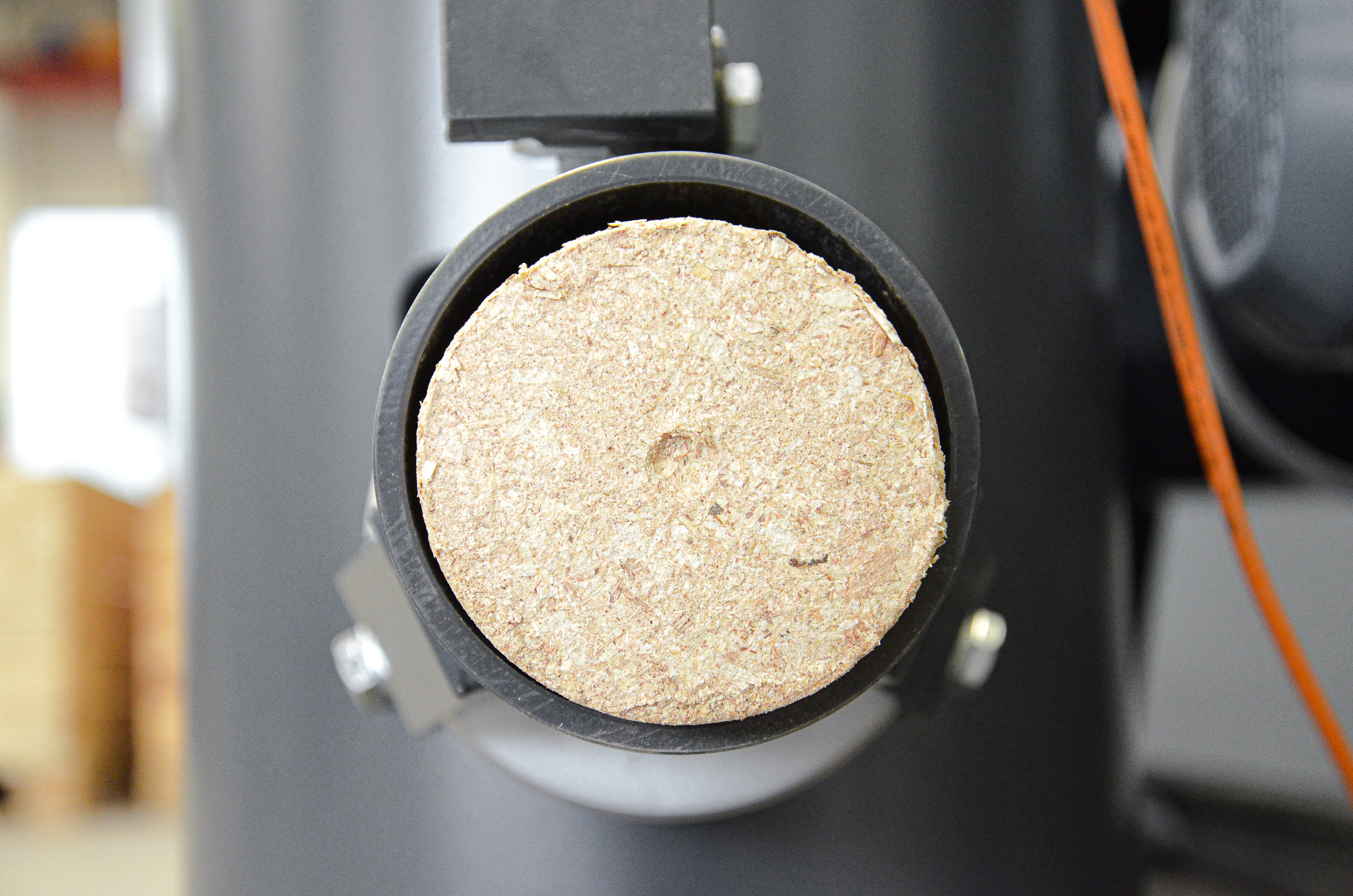 Die Presse erzeugt hochfeste, runde Briketts mit konstantem 50-mm-Durchmesser. Dafür arbeitet im vorderen Bereich der Pressmechanik eine hydraulisch präzise gesteuerte Presszange mit speziell gehärtetem Presszylinder. Das System ist auf dauerhafte Belastung und gleichmäßige Verdichtung ausgelegt. Im Betrieb führt das zu einer zuverlässigen Brikettqualität und zu einer belastbaren Prozessauslegung für unterschiedlichste Anwendungen.
