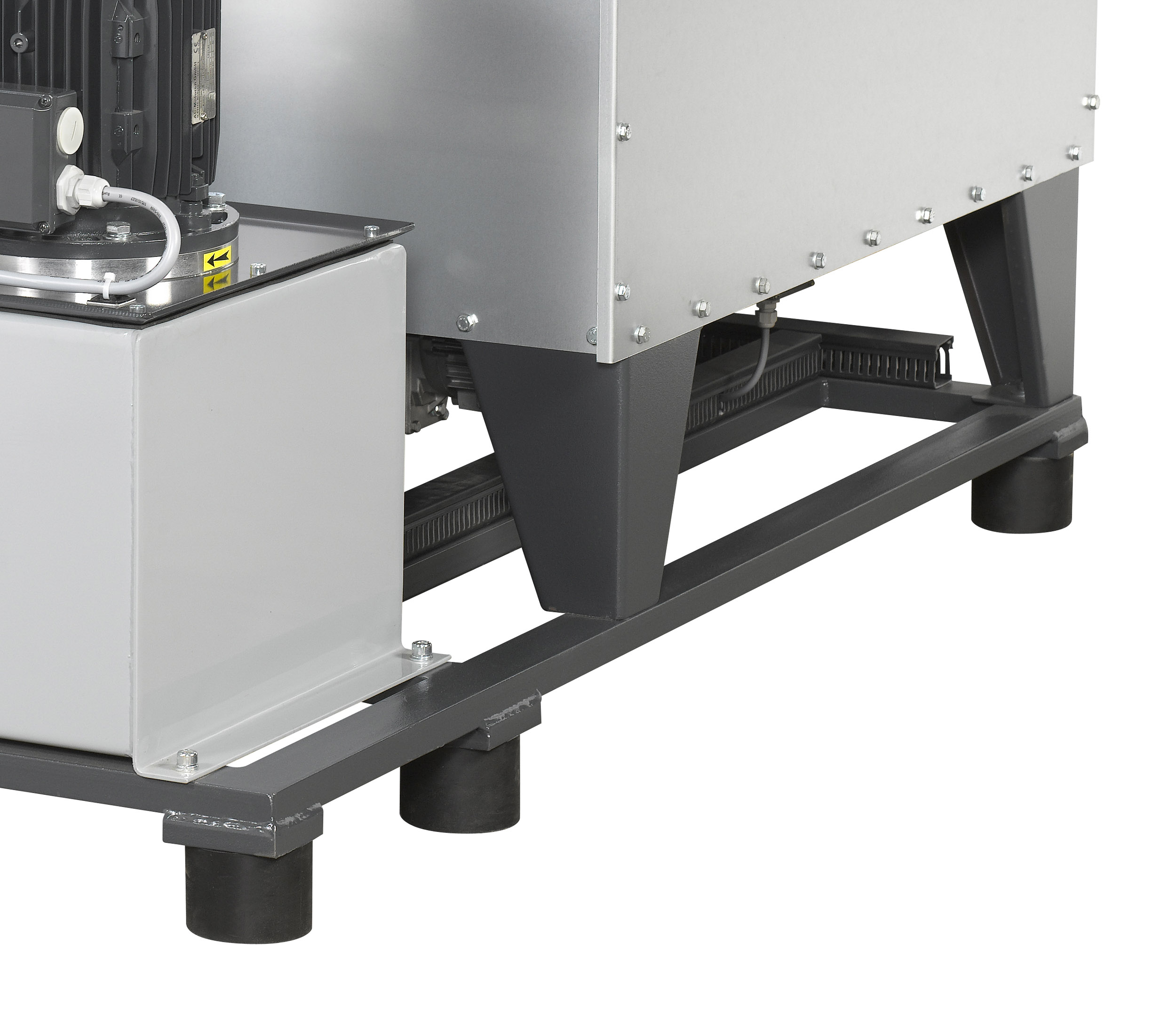 Die Maschine lässt sich stabil und montagefreundlich aufstellen. Schwingungsdämpfende Maschinenfüße aus Hartgummi sorgen für einen vibrationsarmen Stand, ohne dass eine Verankerung im Boden erforderlich ist. Ergänzt wird dies durch einen stabil verschweißten Grundrahmen mit niedriger Bauhöhe. Das erleichtert die Aufstellung, erhöht die Flexibilität bei der Integration und verbessert den Zugang für Bedienung und Wartung.