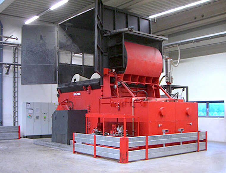 Eine seitlich, oberhalb des Schiebers angeordnete, hydraulisch angetriebene Niederdruckeinrichtung drückt das Material zusätzlich vertikal von oben nach unten, wodurch ein Tanzen der sehr sperrigen Tanks auf dem Rotor verhindert wird. Das zerkleinerte Material wird durch ein unterhalb des Rotors angebrachtes Sieb mit einer Sieblochung von 10 mm ausgetragen. Es wird ein staubarmes Mahlgut mit einer Korngröße von ca. 8-10 mm erzielt.