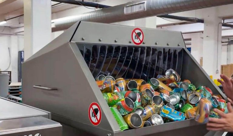 Die WEIMA E.200 wird mit beschädigten Dosen gefüllt.