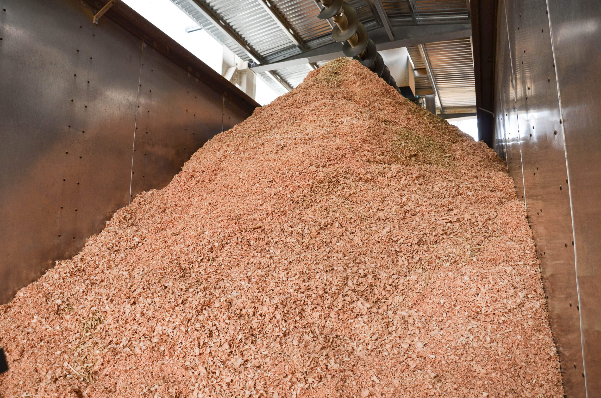 Dank der horizontalen Beschickung erwies sich der WEIMA Tiger 400 Holz-Shredder als ideale Zerkleinerungsmaschine für meist meterlange Leisten und Abschnitte. Eine sogenannte Vibro-Rinne transportiert dabei das Material in den Schneidraum, wo der mit Schneidmessern besetzte V-Rotor die Holzreste shreddert. Die entstandenen Hackschnitzel werden schließlich zentral abgesaugt und über eine Förderschnecke direkt in einen LKW-Container weitergeleitet. Jede Woche ist dieser randvoll gefüllt und steht bereit für den Verkauf.