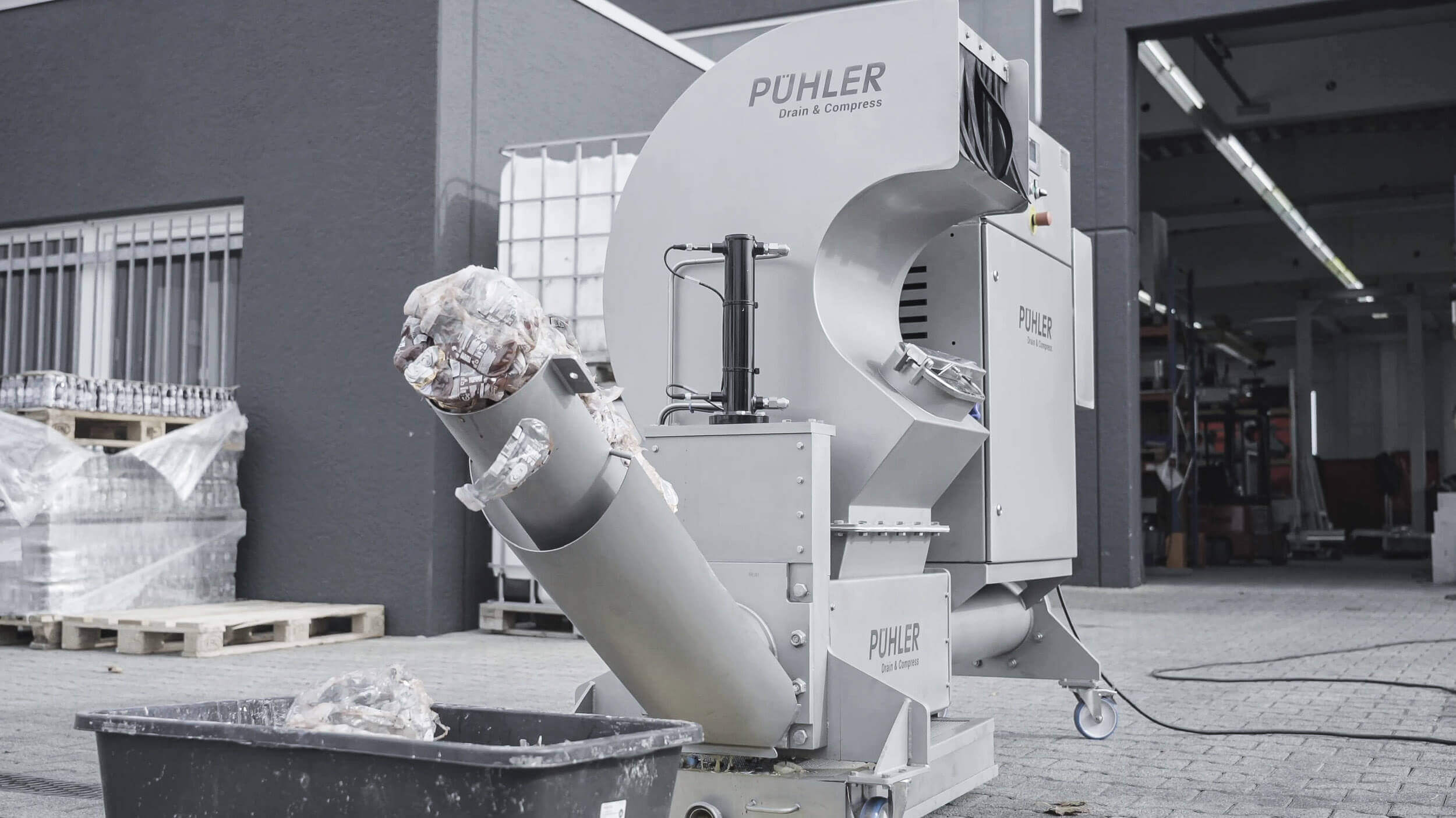 Der geschwungene Einfülltrichter verhindert, dass Dosen oder andere Materialien während des Pressvorgangs durch die enorme Presskraft aus der Maschine entweichen. Darüber hinaus erleichtert die geschwungene Form die Reinigung und verhindert das unkontrollierte Herausspritzen ausgepresster Flüssigkeit aus der Befüllöffnung.