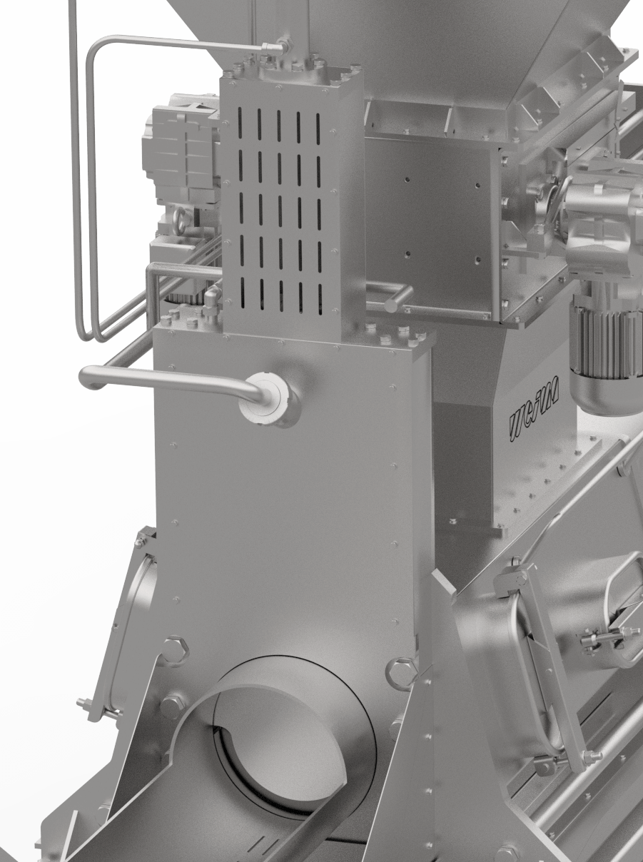 Optional kann der Aufgabetrichter mit einem horizontalen Rührwerk ausgestattet werden. Dieses verhindert die Bildung von Materialbrücken und gewährleistet eine gleichmäßige, kontinuierliche Zuführung zum Pressprozess.
