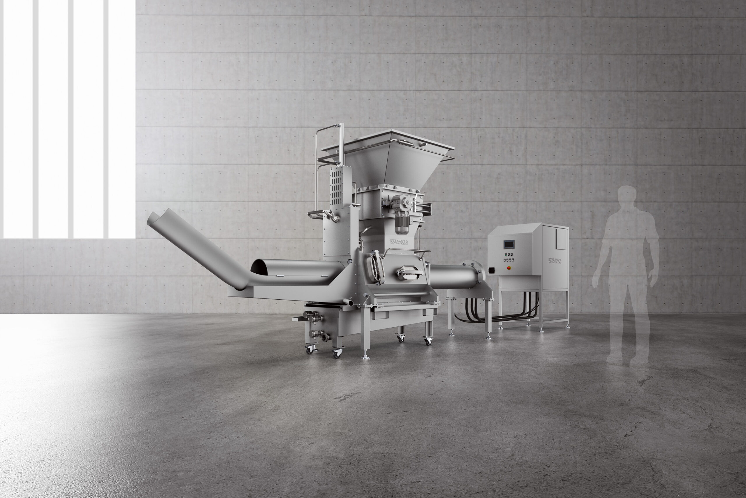 Der Einfülltrichter nimmt das zu entwässernde Material wahlweise manuell, per Förderband oder über eine Hebekippvorrichtung auf. Mit einem Fassungsvermögen von 1.000 Litern bietet er ein großzügiges Puffervolumen und sorgt so auch bei schwankender Materialzufuhr für einen kontinuierlichen Prozess. Für die G.300 Duo Hygienic Design ist optional ein Trichter mit 2.000 Litern Volumen erhältlich.
