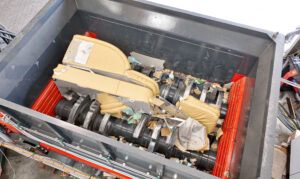 Der Schneidtisch ist mit dem EES (Easy Exchange System) ausgestattet und kann komplett mit Schneidwellen aus dem Maschinengestell entnommen werden. Der schnelle Austausch reduziert Umrüstzeiten und ermöglicht eine flexible Anpassung des Zerkleinerers an wechselnde Materialanforderungen im industriellen Betrieb.