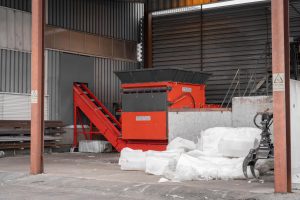 Zwei WEIMA S7.25 und S5.18 Einwellen-Zerkleinerer zerkleinern Folienabfälle für Recyclingzwecke und die Herstellung von Regranulat bei Fiberon mit EREMA Extrusionslinien.