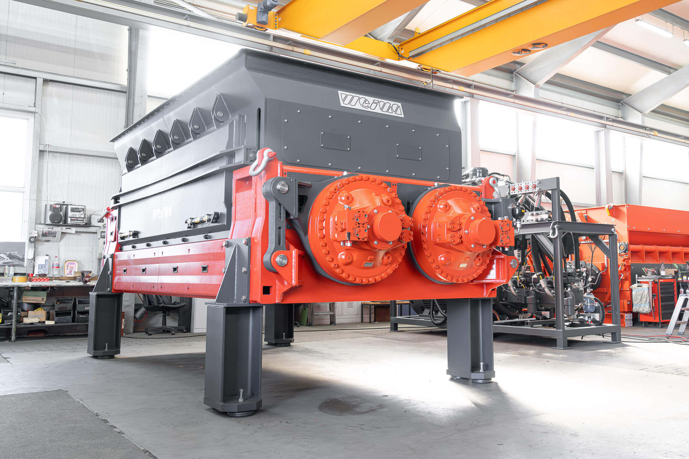 Below you will find an overview of the technical specifications, applications and available options for the WEIMA M8.28 heavy-duty twin-shaft pre-shredder.