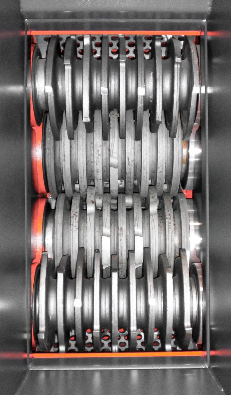 The material is gripped and shredded by the cutting teeth of the cutting discs, and then pressed through the cutting gaps between the cutting discs by the clearing discs. In addition, the broaching discs ensure optimized material discharge through the screen. Thanks to the self-feeding system, the machines do not require a hydraulic pusher system. This reduces the need for maintenance.