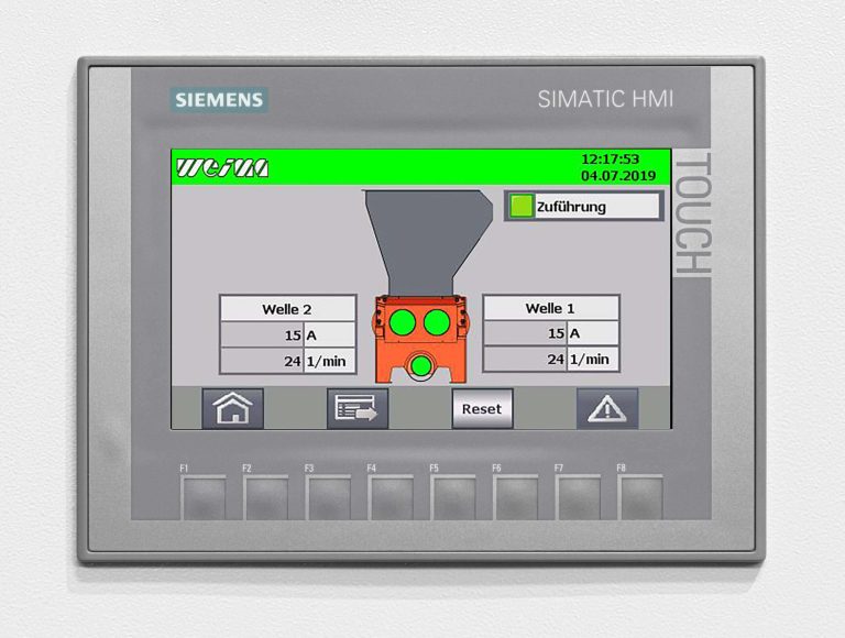 The multi-shaft shredders can be operated in a user-friendly manner via a high-quality Siemens PLC control system. A touch display is also available as an option. For a particularly small footprint, the control cabinet is mounted on the side of the hopper. It is also available as a free-standing unit on request.