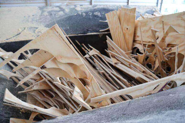 The shredder itself is fed continuously by a conveyor located beneath the plant’s main chop saw. End cuts fall onto the conveyor and feed the shredder throughout the day. Other wood skeletons, which come off of CNC routers throughout the plant, are loaded into the shredder using a forklift.