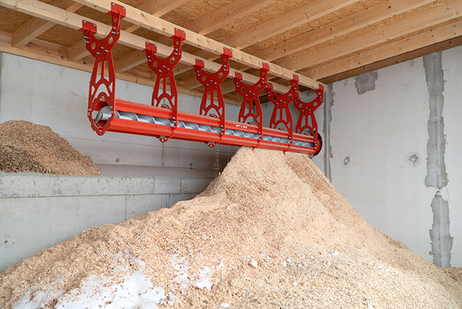 As soon as the wood waste has been shredded by the 1000 mm wide V-Rotor equipped with cutting blades, the fully automatic material discharge of the single-shaft shredder takes effect. With a screw conveyor and the Steiner bunker transfer spiral, the wood chips are evenly distributed into the adjacent bunker.