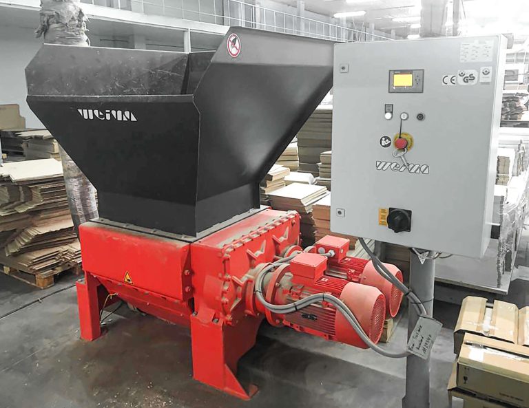 Two powerful electric motors drive the four shafts. Due to the slow speed of approx. 25 rpm, an extremely high torque is developed. This enables a high throughput rate with low power consumption. The furniture company is particularly enthusiastic about the simple operation via Siemens PLC control, the high reliability of the shredder, and the high throughput.
